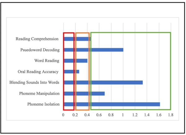 *Cohen’s d effect sizes are measures of practical significance as different from statistical significance and are reported in standard deviation units. The larger the effect size, the greater the real-world significance. In the graph above, “0” represents the 50th percentile (average) in a normally distributed group of same-age peers.